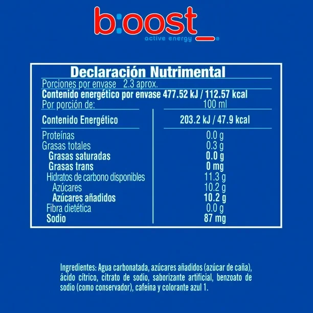 Boost Energy te dará ese toque de energía acompañado de un delicioso sabor a mora azul en una bebida gaseosa